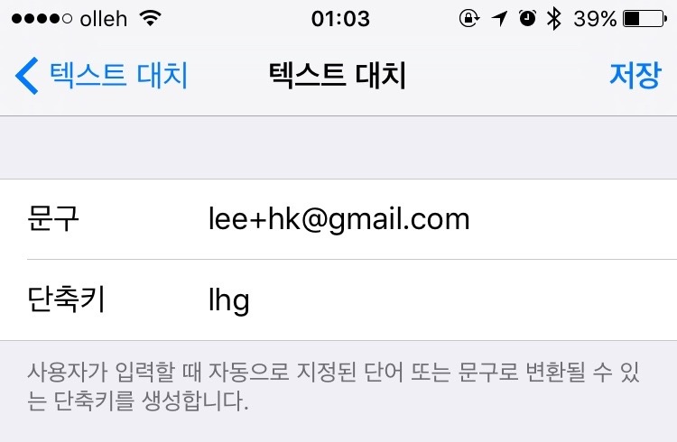 아이폰 기본 기능인 '텍스트 대치' 기능을 사용하면 번거롭게 이메일 주소를 모두 적는 수고를 덜 수 있습니다. 설정 > 키보드 > 텍스트 대치에서 위 이미지와 같이 문구와 단축키를 지정해줍니다. 추후 단축키로 지정한 lhg만 입력하면 문구 부문에 적힌 이메일 주소가 자동으로 입력됩니다.
