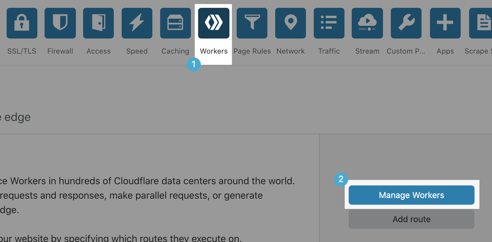➊ 이제 CloudFlare의 Web Workers를 이용해 앞서 추가한 서브도메인의 HTTP 요청을 자동 변환하는 세팅을 해야 한다. 대시보드 상단에 있는 Worker 아이콘을 클릭한 뒤 하단 Manage Workers 버튼을 클릭한다.
