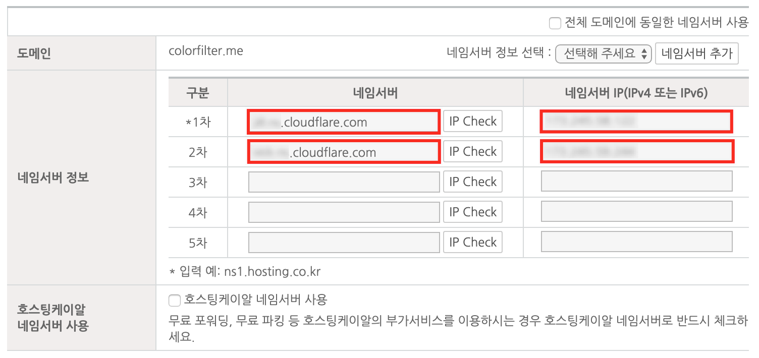 ➌ 네임서버를 변경하면 기존 등록했던 네임서버 설정이 모두 지워지므로 Cloudflare에서 다시 등록해야 한다. 더 자세한 네임서버 변경 내용은 링크를 참고하면 된다.