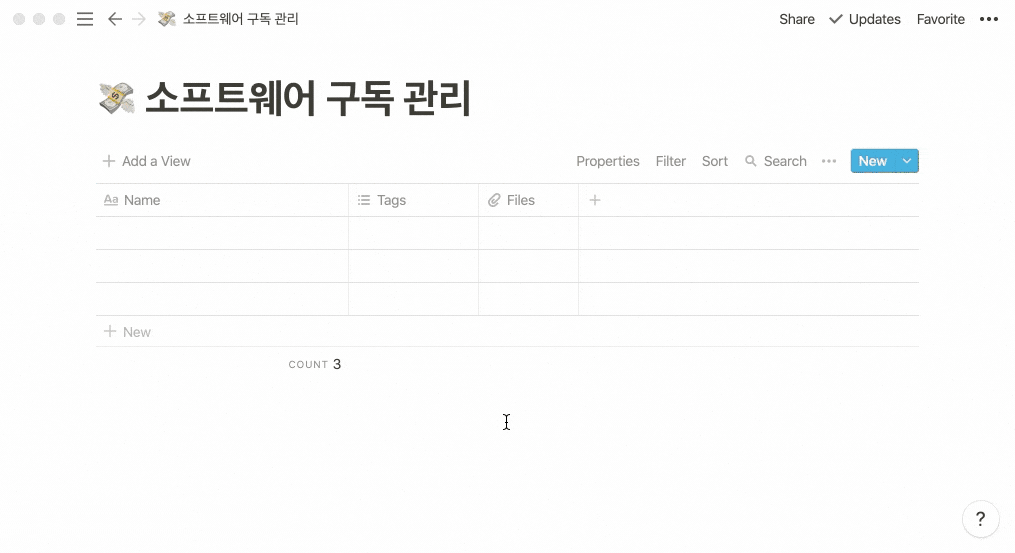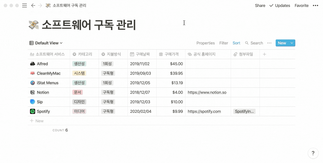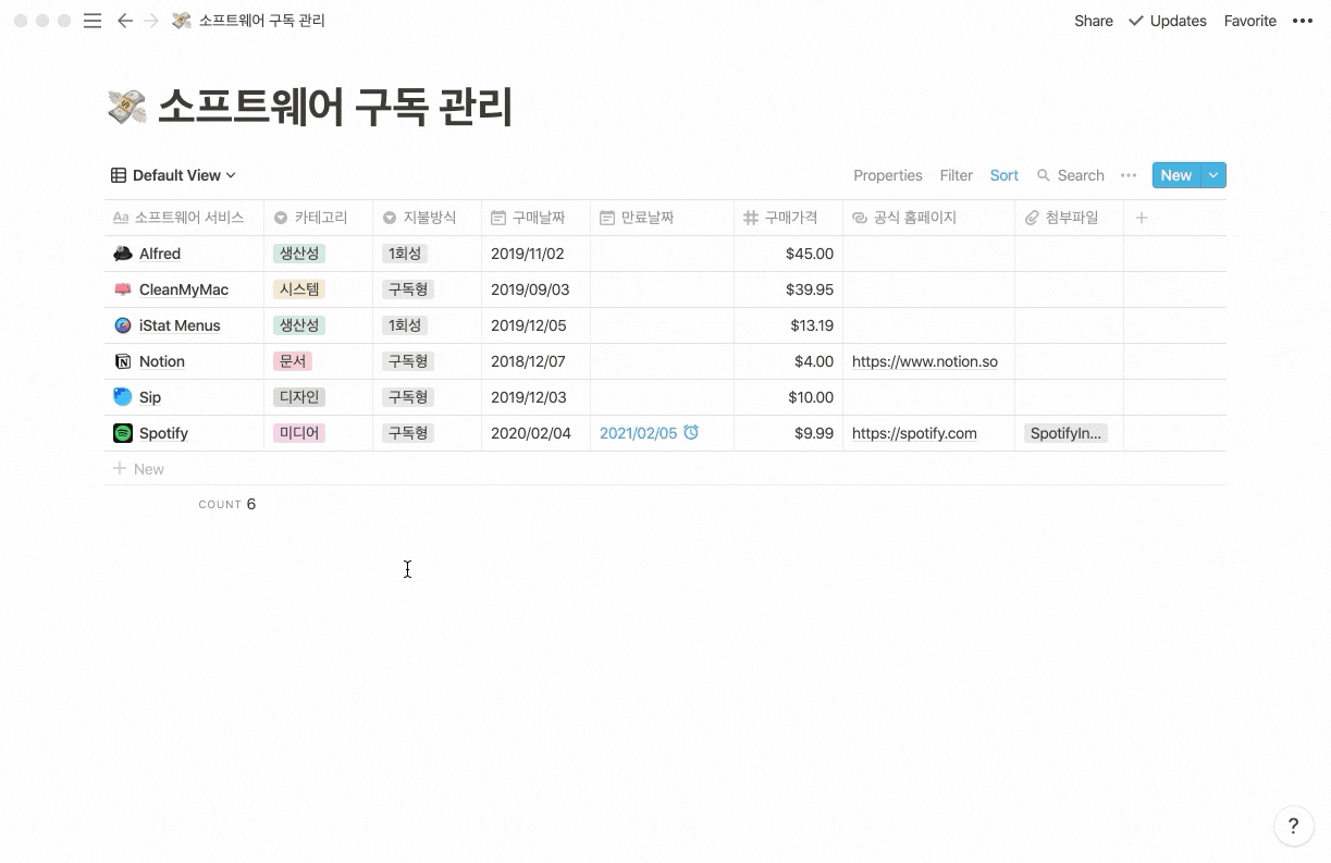 구매한 소프트웨어나 서비스가 많아질수록 라이선스 넘버, 영수증, 구매한 이메일 주소 등 반복적으로 기록해야 할 것들이 생기기 마련이다. 이렇게 반복적으로 기록해야 하는 것들은 Database 템플릿 기능을 활용하면 된다. 기본적인 구매 정보를 열거해보면 아래 4가지 정도 될 것 같다.