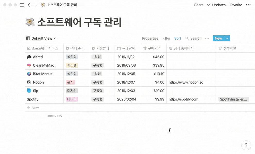 소프트웨어를 추가하고 싶다면 좌측 하단 + New 버튼을 눌러 새로운 Page를 생성한다. 이 페이지에 서비스 이름, 카테고리, 구매날짜, 구매가격, 홈페이지 주소 등을 입력하면 된다. ▼