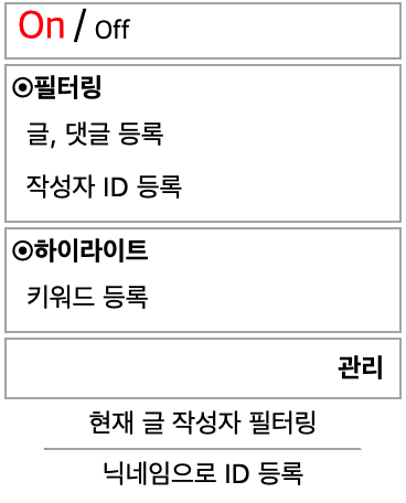 부가 기능 아이콘 우클릭 후 "옵션" 버튼을 누르면 추가한 필터링 키워드와 ID 목록이 나온다. 리스트를 내보내거나 가져올 수 있어 다른 기기에서 사용할 때도 유용하다.