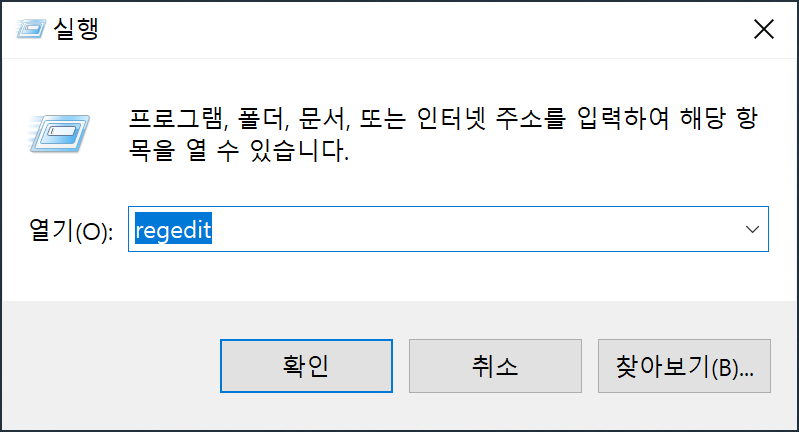 1. Win+R 단축키를 눌러 "실행"창을 띄운 뒤 regedit 을 입력한다. 확인 버튼을 누르면 레지스트리 편집기가 실행된다.