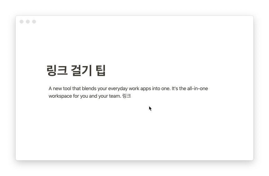 ❶원하는 링크를 복사해두고 ❷링크 걸고 싶은 텍스트를 선택하여 ❸붙여넣기 단축키(CTRL/CMD+V)를 입력하면 해당 텍스트에 하이퍼링크가 생성된다. 개인적으로 아주 유용하게 쓰고 있는 기능이다. 아쉽게도 이 방법은 웹브라우저에선 안되고 Mac/Windows 노션 클라이언트에서만 가능하다. 또 현재 작성하고 있는 페이지 안에서 복사한 링크는 안된다(다른 페이지나 외부에서 복사한 링크만 가능).