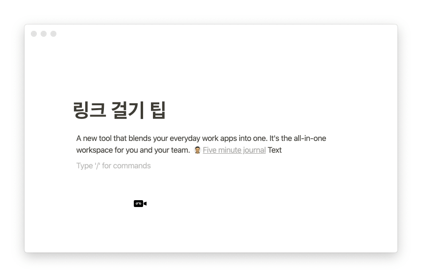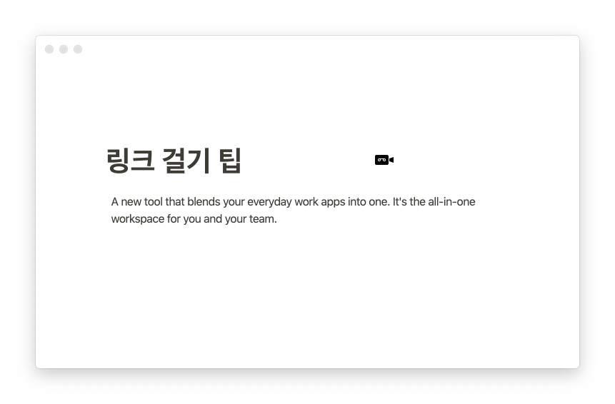 이 방법은 @(골뱅이) 단축키로 삽입한 페이지 링크와는 다르게 하나의 블록(Block)을 모두 차지한다. 노션 페이지 링크를 복사-붙여넣기 했을 때 기본적으로 이 형식(↗︎ Link to page)으로 삽입된다.