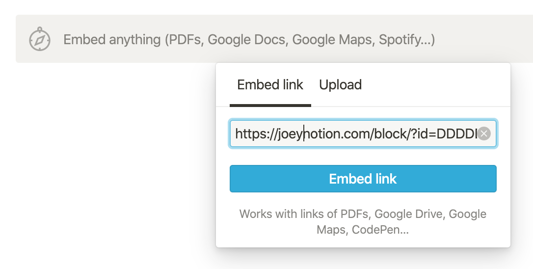 삽입하고 싶은 노션 페이지에서 /embed를 입력하고 방금 복사한 링크를 붙여 넣기 한다. Embed link 버튼을 누르고 잠시 기다리면 Joey 댓글창이 나타난다.