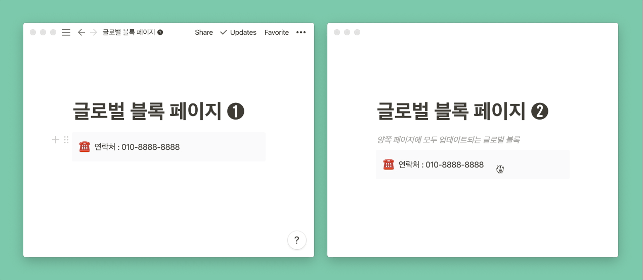 Notion VIP 페이지를 둘러보던 중 재밌는 트릭을 발견했다. 글로벌 블록(다이내믹 블록)을 생성하여 2개 이상의 페이지에서 동기화하는 방법이다. 한 페이지에서 글로벌 블록에 있는 텍스트를 수정하면 이 블록이 삽입된 모든 페이지에 자동 업데이트된다. 아래 예시를 보면 이해하기 쉽다.