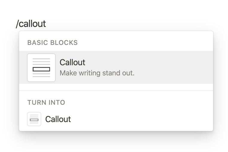 Enter를 입력하여 원하는 블록을 생성한다(Callout 등 모든 유형의 블록 가능). 이해를 돕기 위해 아래 예시는 다른 블록과 구분하기 쉬운 /Callout을 입력했다.