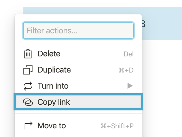 방금 생성한 블록 좌측 끝에 있는 ⫶⫶ 메뉴를 우클릭 한 뒤 Copy link 버튼을 눌러 링크를 복사한다.