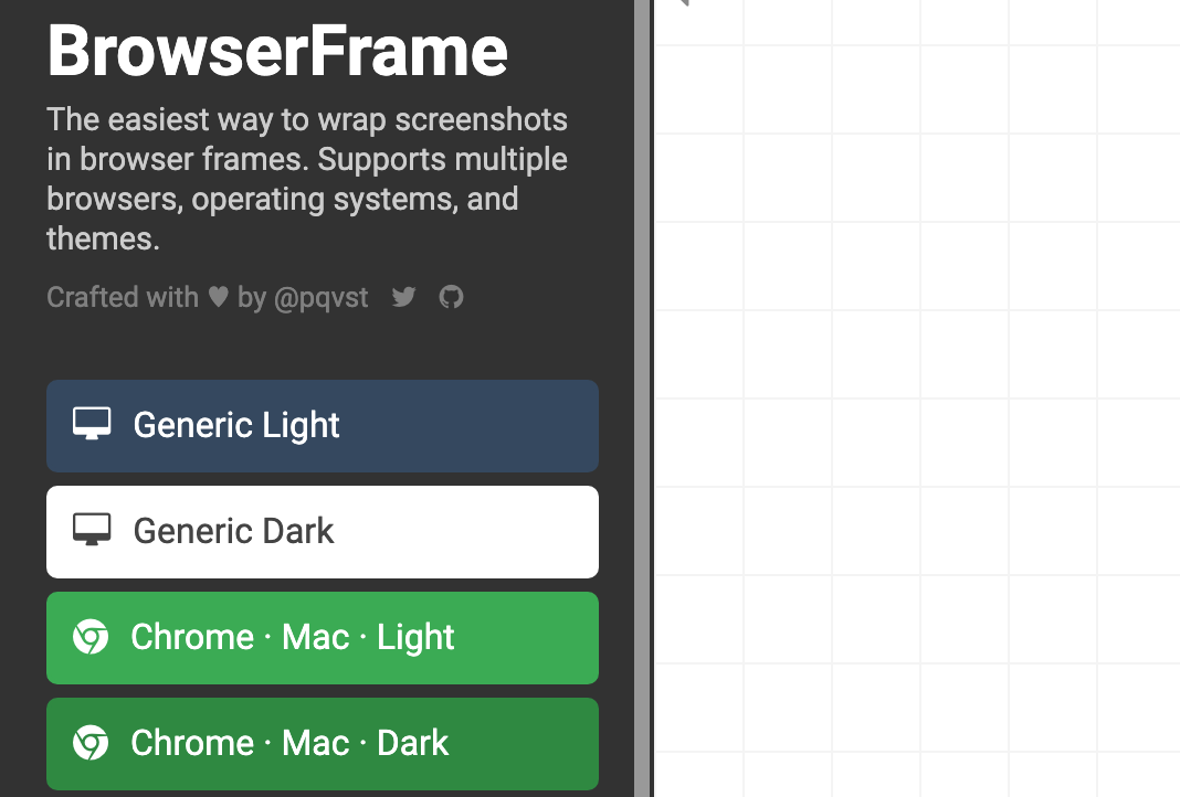🔎 브라우저 프레임 종류를 바꾸고 싶다면 좌측 메뉴에서 직접 선택하면 된다. 총 16가지의 프레임을 제공한다. Generic은 주소창이 빠진 사파리 프레임이다.