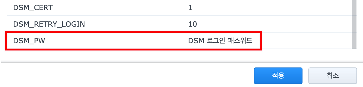 - 변수 값 DSM 로그인 패스워드 입력