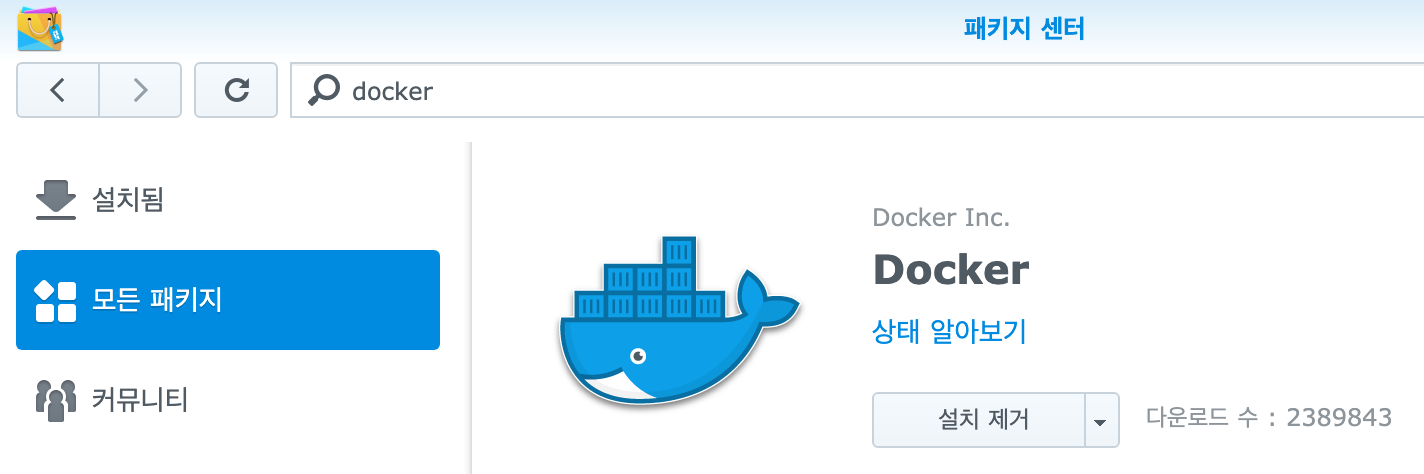 ➊ 도커 설치 : 제어판 → 패키지 센터 → Docker 검색 → 설치