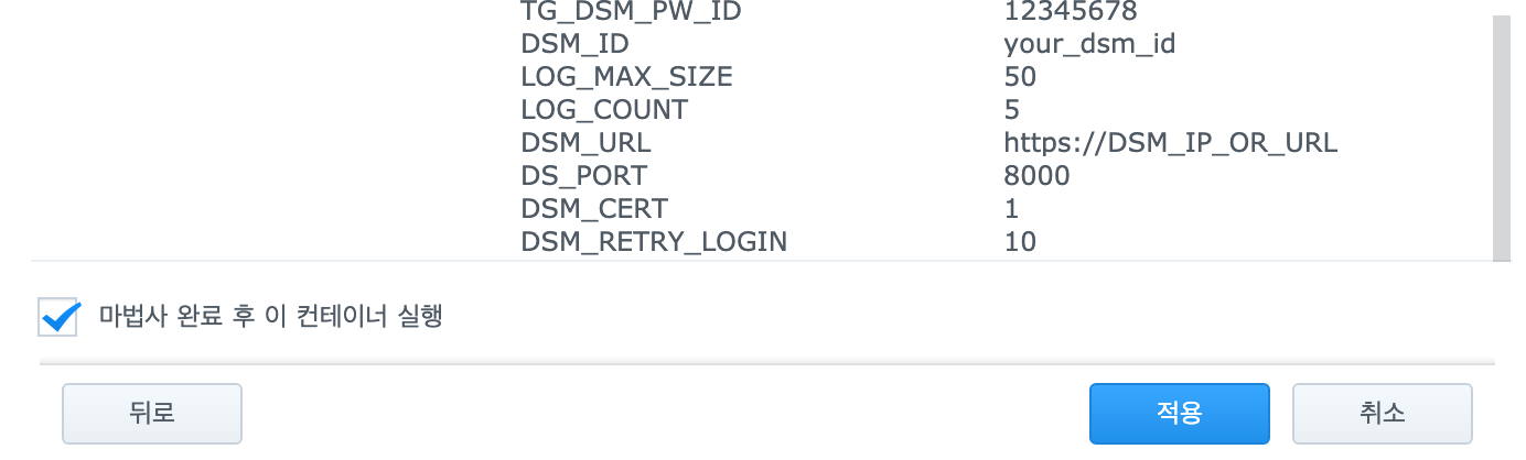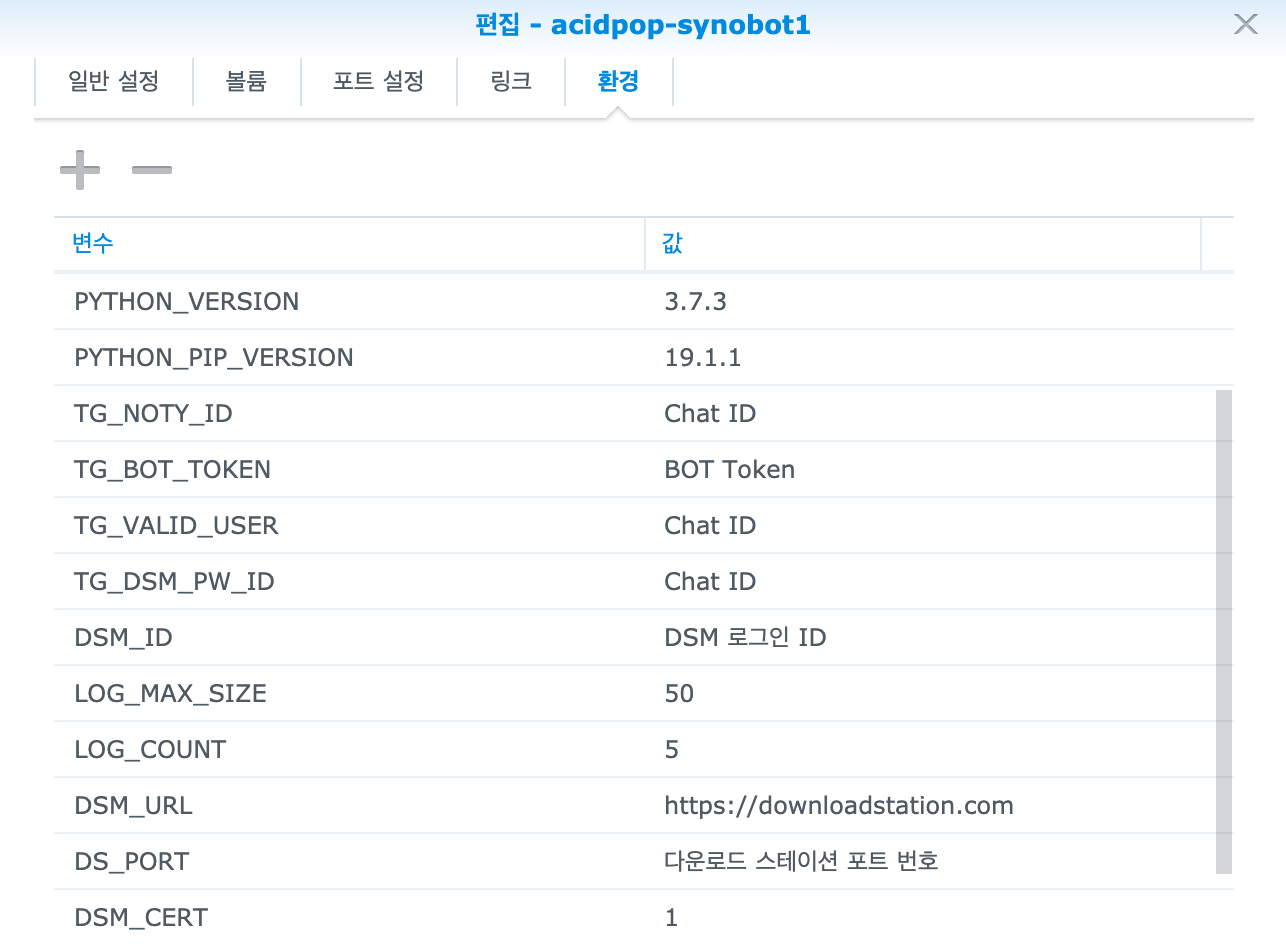 - TG_DSM_PW_ID : 다운로드 스테이션 로그인 시 암호를 물어볼 텔레그램 Chat ID