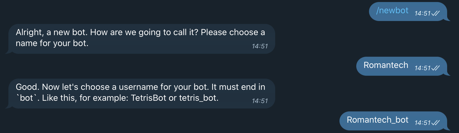 ➋ /start 클릭(혹은 입력) → /newbot 입력 → 원하는 봇 네임 입력