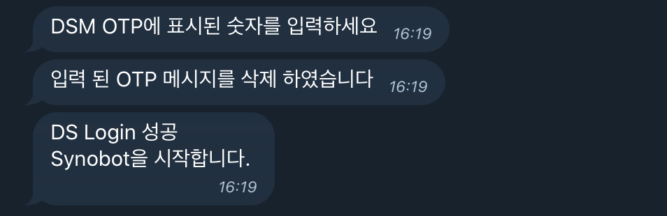 Synobot 컨테이너를 실행하면 비밀번호 혹은 2단계 인증 OTP 번호(2단계 인증 켜 둔 상태일 때) 입력을 요청하는 텔레그램 메시지가 온다. 봇 메시지 창에 요청한 내용을 입력하면 DS Login 성공 메시지가 뜨면서 봇이 시작된다.