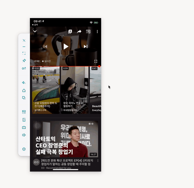 Youtube 앱 비디오 전체 화면, 게임 등 모바일 스크린이 가로 전체 화면으로 전환되면 Wormhole 프로그램 역시 자동으로 회전한다. Wormhole 모서리 부분을 드래그하여 화면 크기를 조절할 수도 있다.