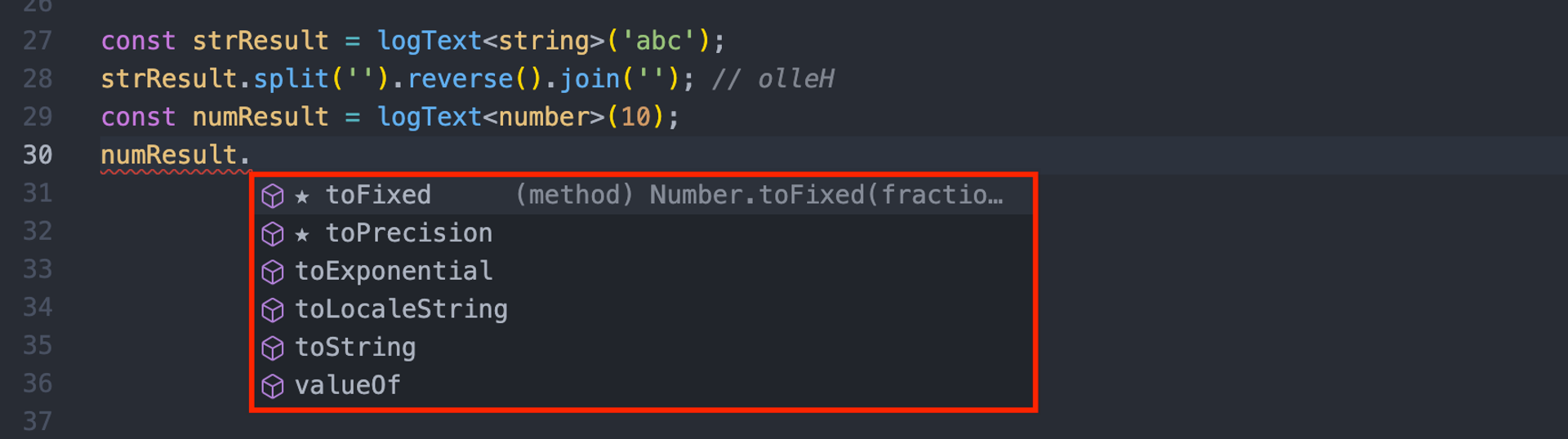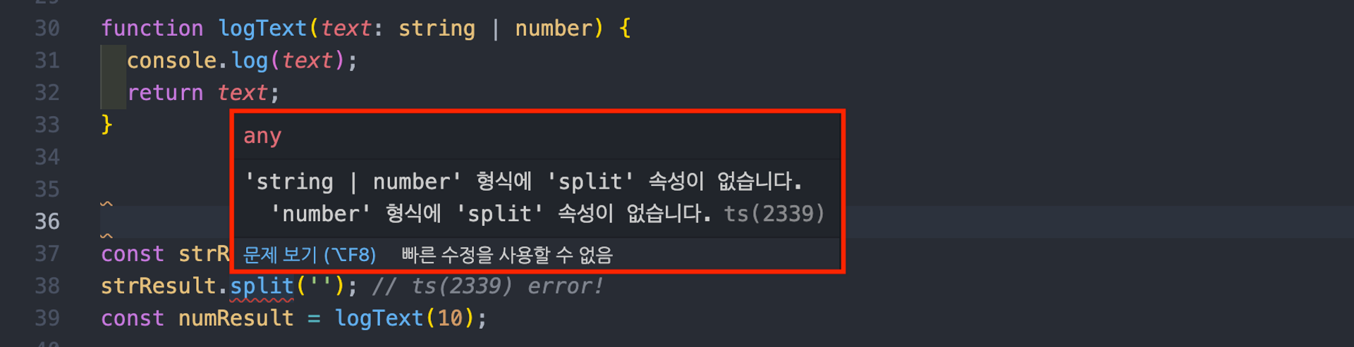const num = logNumber(10); // ๊ฒฐ๊ณผ ๋ณ์์ number์ ๊ด๋ จ๋ API๋ฅผ ์ฌ์ฉํ ์ ์๋ค.