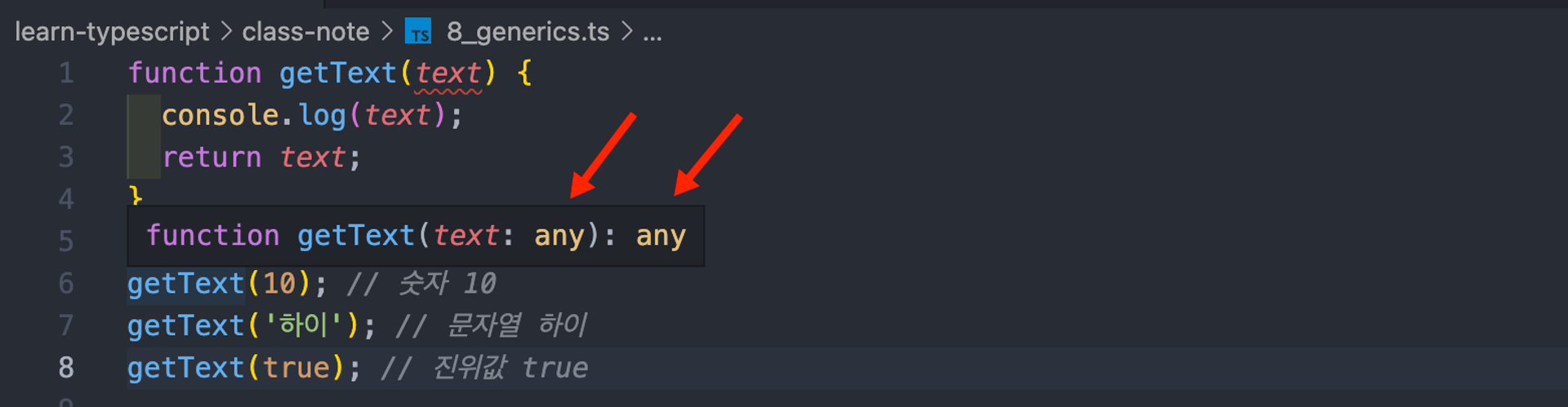 getText<string>('hi'); // ํน์ getText('hi')