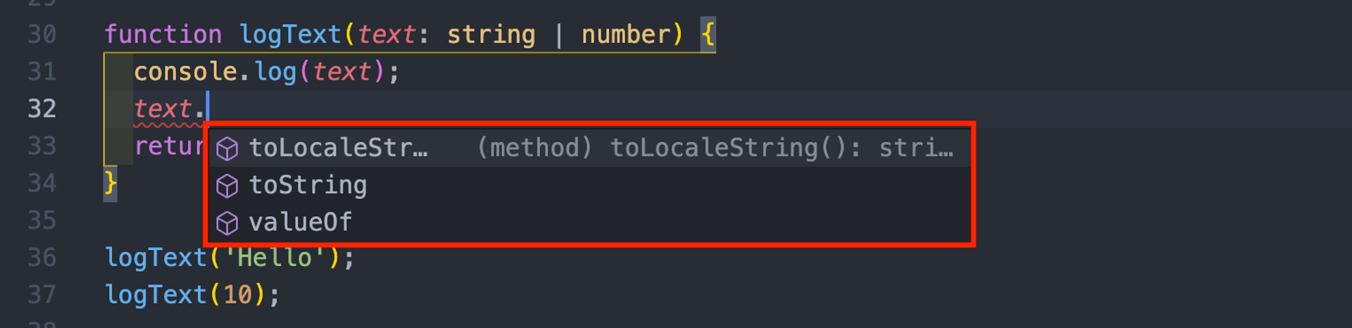 const str = logText('Hello'); // ๊ฒฐ๊ณผ ๋ณ์์ string๊ณผ ๊ด๋ จ๋ API์ฌ์ฉํ ์ ์๋ค.