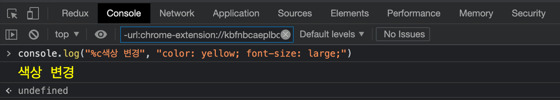 console.log("%c์์ ๋ณ๊ฒฝ", "color: yellow; font-size: large;")