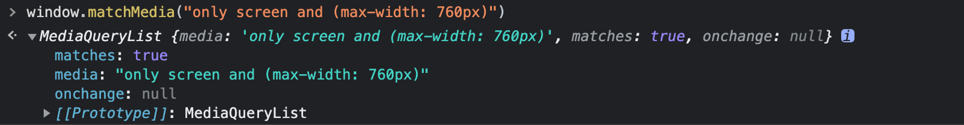์๋ ์ฝ๋์์ window.matchMedia() ๋ฉ์๋๊ฐ ๋ฐ์ ํ๋ผ๋ฏธํฐ์ ๋ฏธ๋์ด ์ฟผ๋ฆฌ๋ฌธ์ 760px์ ์ด๊ณผํ์ง ์๋ ์คํฌ๋ฆฐ์์๋ง ์ ํจํ๋ค. window.matchMedia() ๋ฉ์๋๊ฐ ๋ฐํํ๋ ๊ฐ์ฒด์ matches ์์ฑ์ boolean ๊ฐ์ ๋ฐํํ๋ค. true ๋ผ๋ฉด ๋ฏธ๋์ด ์กฐํ(media query)์ ์ฑ๊ณตํ๋ค๋ ๋ป์ด๊ณ , ๊ทธ๋ผ ์ ์ ์ ํ์ฌ ์ฅ์น๋ ๋ชจ๋ฐ์ผ์ด๋ผ๊ณ ๋ณผ ์ ์๋ค.