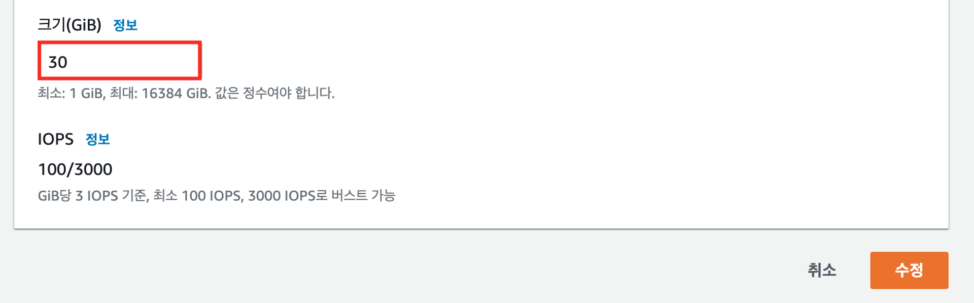 โถ EC2 ๋์๋ณด๋ → [์ธ์คํด์ค] → [์คํ ๋ฆฌ์ง] → ๋ณผ๋ฅจ ์ ํ → [๋ณผ๋ฅจ ์์ ] ๋ฒํผ ํด๋ฆญ