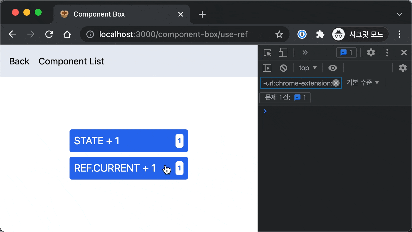 ๋ฐ์ดํธ ๋๋ค. ๋ฐ๋ฉด ํ๋จ ๋ฒํผ์ ํด๋ฆญํด์ ref.current ๊ฐ์ด ๋ณํด๋ ๋ฆฌ๋ ๋๋ง์ด ๋ฐ์ํ์ง ์์ผ๋ฏ๋ก ํ๋ฉด์๋ ์