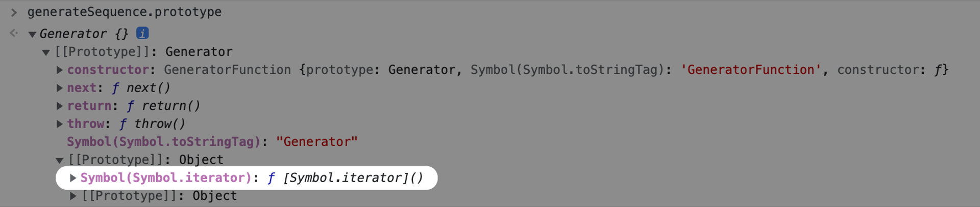console.log(Symbol.iterator in generateSequence.prototype); // true