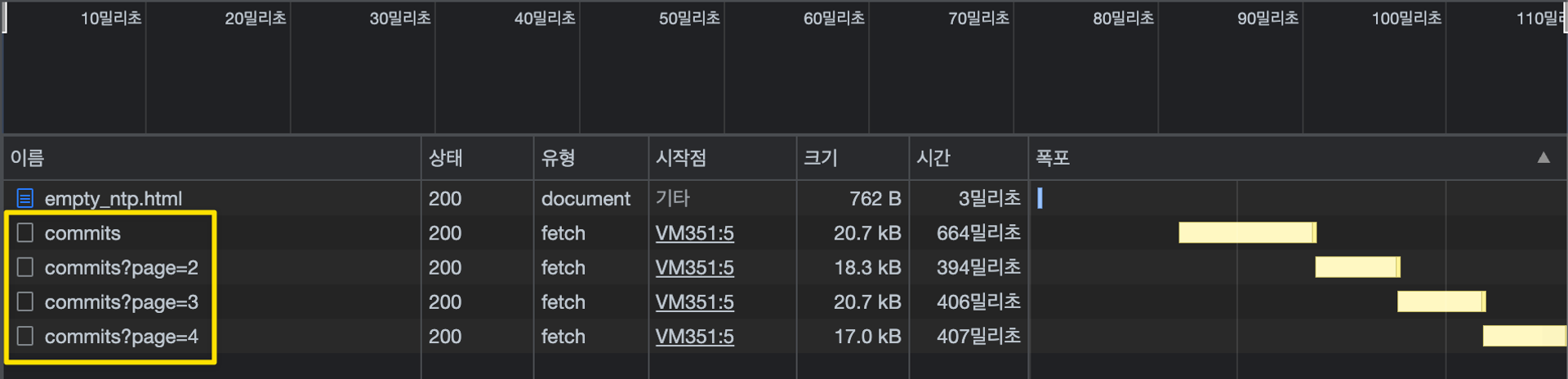 https://api.github.com/repos/<repo>/commitsURL๋ก ์์ฒญ ์ ์ก - ์๋ฒ(GitHub)์์ 30๊ฐ์ ์ปค๋ฐ ์ ๋ณด๊ฐ ๋ด๊ธด JSON๊ณผ, ๋ค์ ํ์ด์ง์ ๋ํ Link๋ฅผ Header์ ๋ด์ ์๋ต