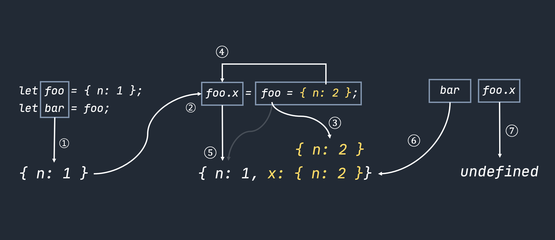 ์ ๋ฌธ์ ๋ฅผ ์ผํ ๋ณด๋ฉด foo.x์ ๊ฒฐ๊ณผ๋ { n: 2 }์ผ ๊ฒ ๊ฐ์ง๋ง ์๋๋ค. foo.x๋ undefined๋ฅผ ์ถ๋ ฅํ๋ค. ์ ์ฝ๋์ ์ฐ์ฐ ๊ณผ์ ์ ํ๋ํ๋ ํ์ด๋ณด๋ฉด ์๋์ ๊ฐ๋ค.
