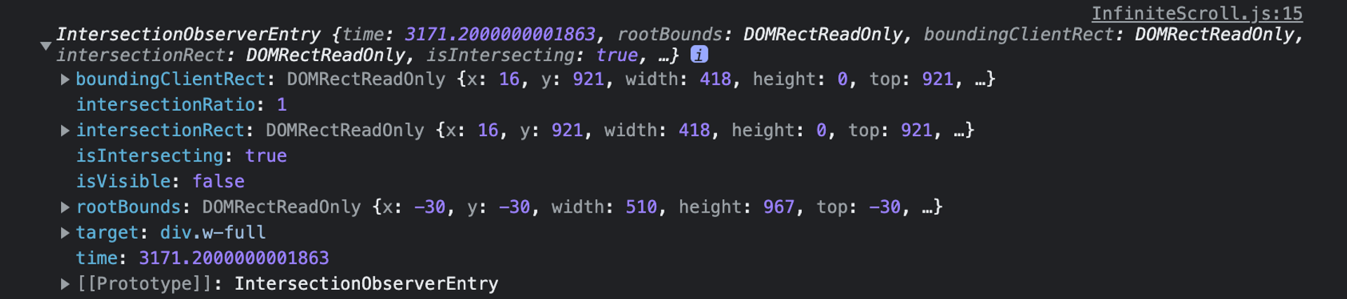 console.log(`๊ฐ์ง๊ฒฐ๊ณผ : ${isIntersecting}`);