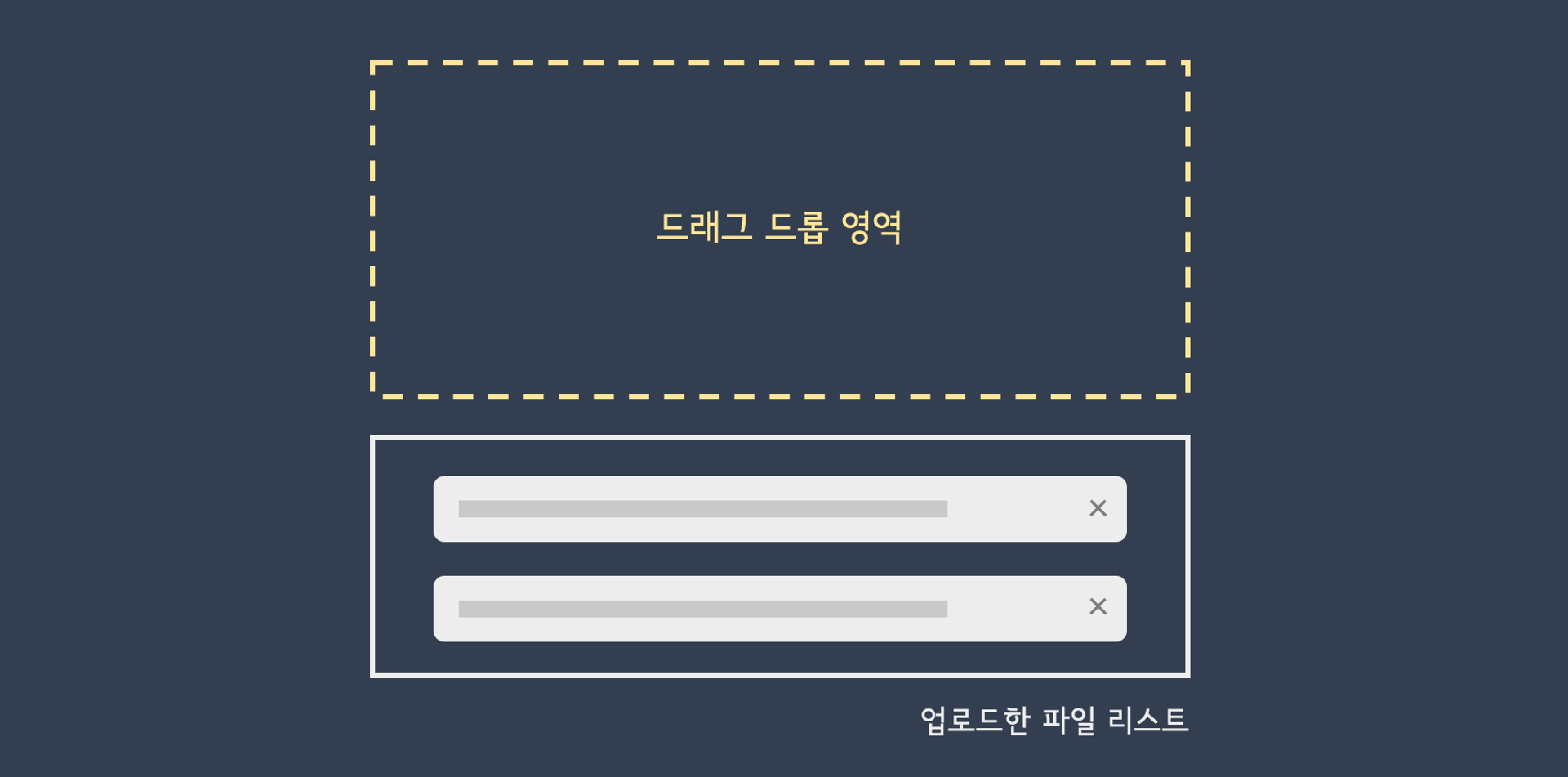 - ํ์ผ์ ์ ๋ก๋ํ๋ฉด ๋๋กญ ์์ญ ํ๋จ์ ์ ๋ก๋ํ๋ ํ์ผ๋ช ๋ฆฌ์คํธ๋ฅผ ๋ณด์ฌ์ค๋ค.