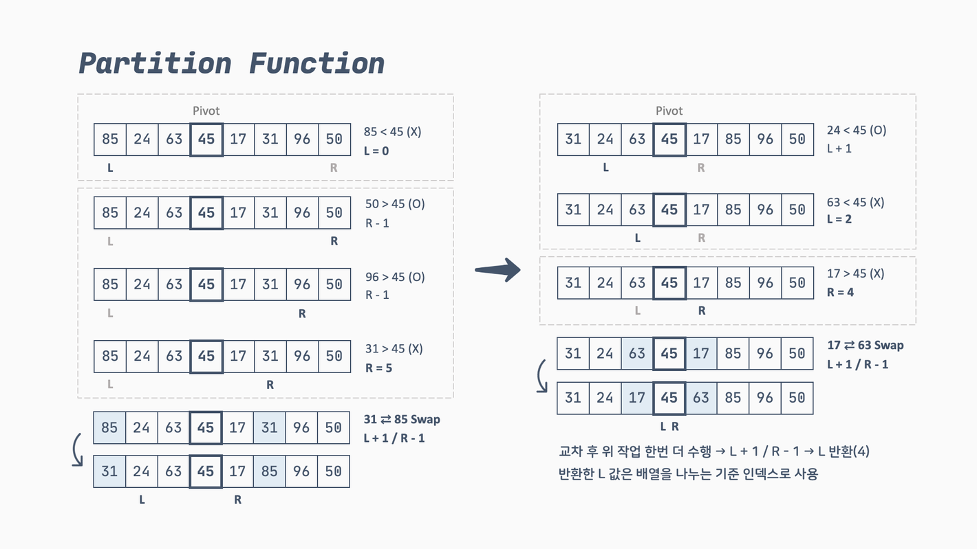 - ๊ธฐ์ค ์์๋ณด๋ค ์์ ์์๋ ์ผ์ชฝ์ผ๋ก ์ด๋, ๊ธฐ์ค ์์๋ณด๋ค ํฐ ์์๋ ์ค๋ฅธ์ชฝ์ผ๋ก ์ด๋