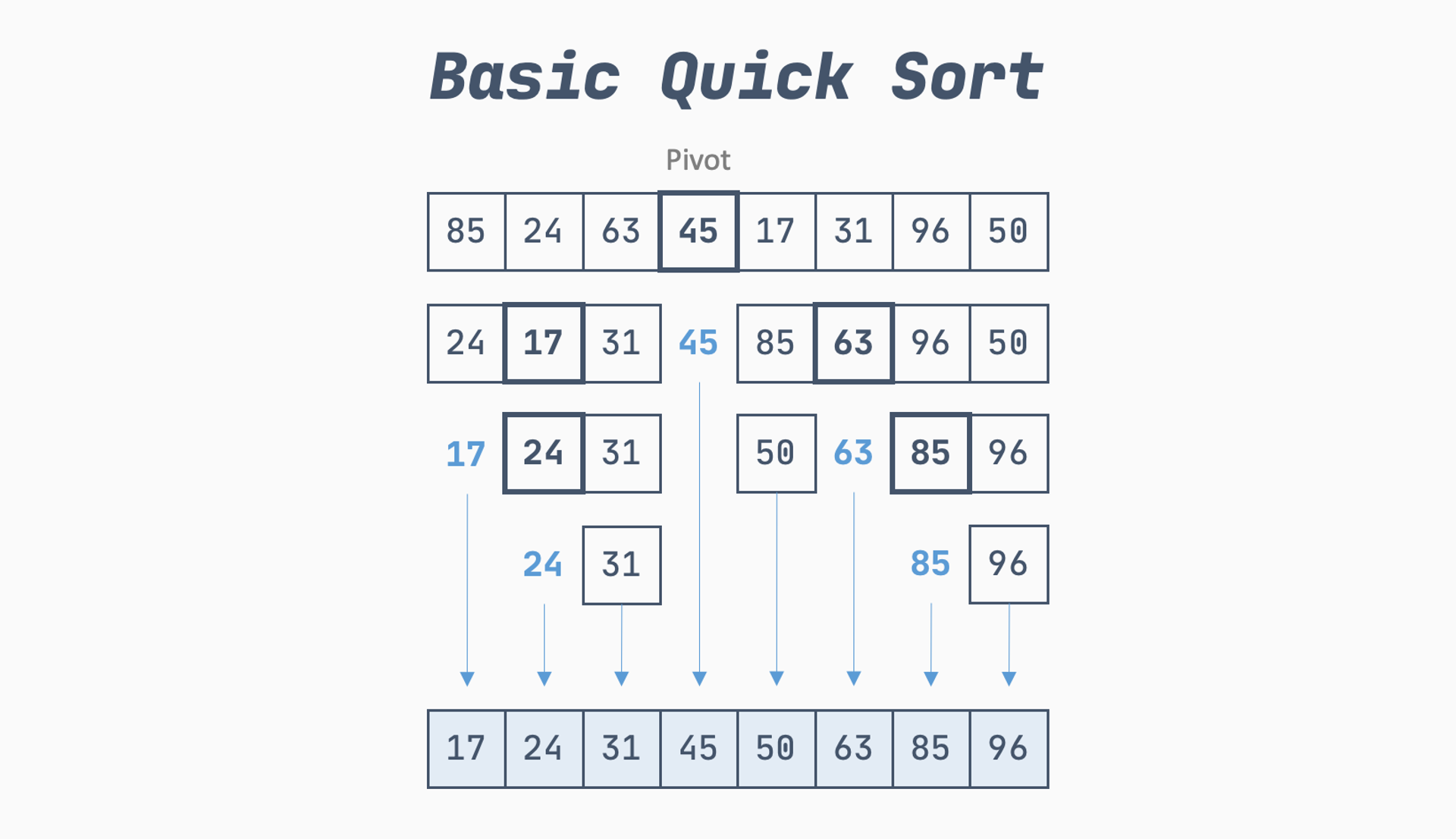 const sorted = quickSort([85, 24, 63, 45, 17, 31, 96, 50]);