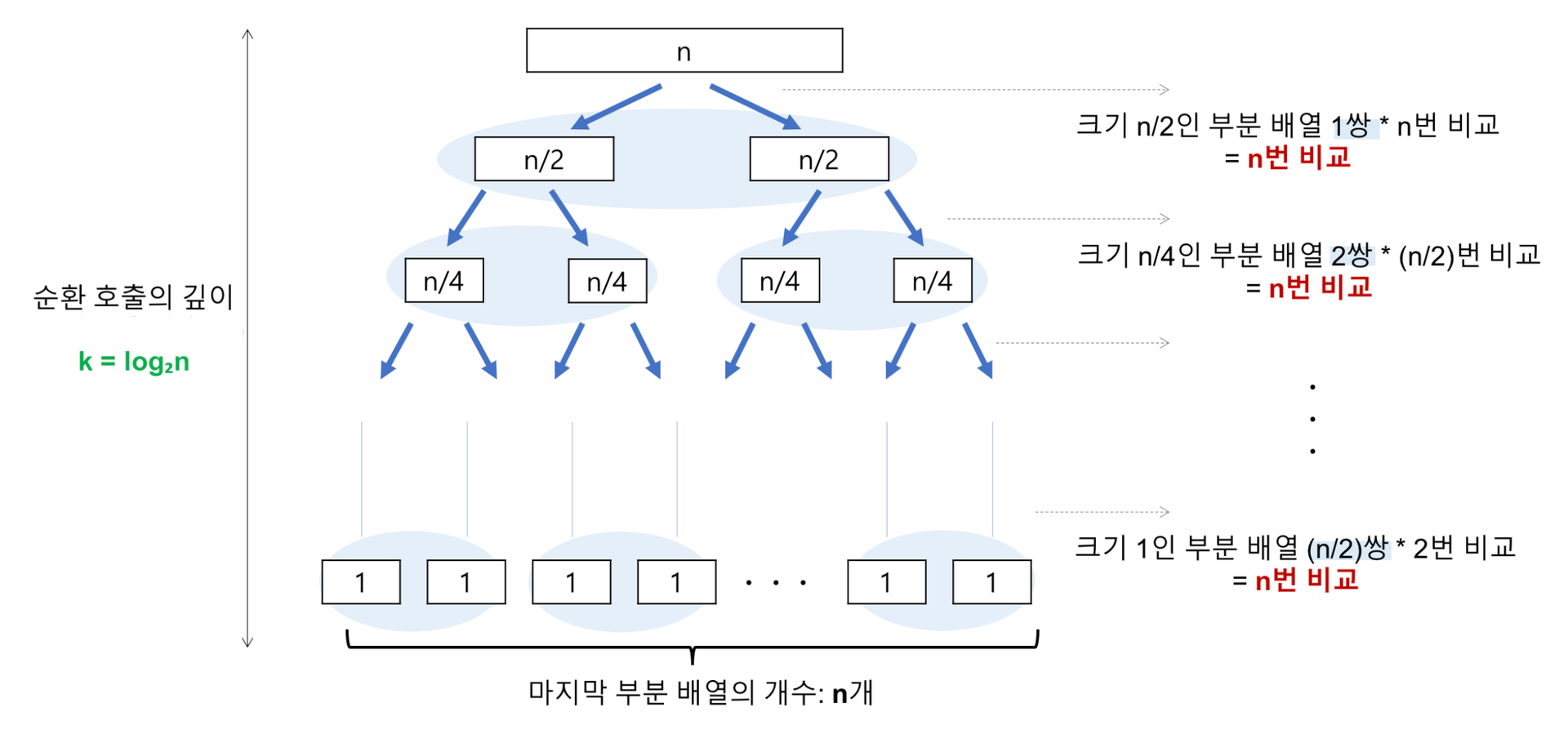 n๋ฒ์ ๋น๊ต ์ฐ์ฐ์ ์ํํ๋ฏ๋ก ์๊ฐ ๋ณต์ก๋๋…๊ฐ ์ํ ํธ์ถ ๋จ๊ณ์ ๋น๊ต ์ฐ์ฐ(n) × ์ํ ํธ์ถ ๊น์ด(logโn) = nlogโn