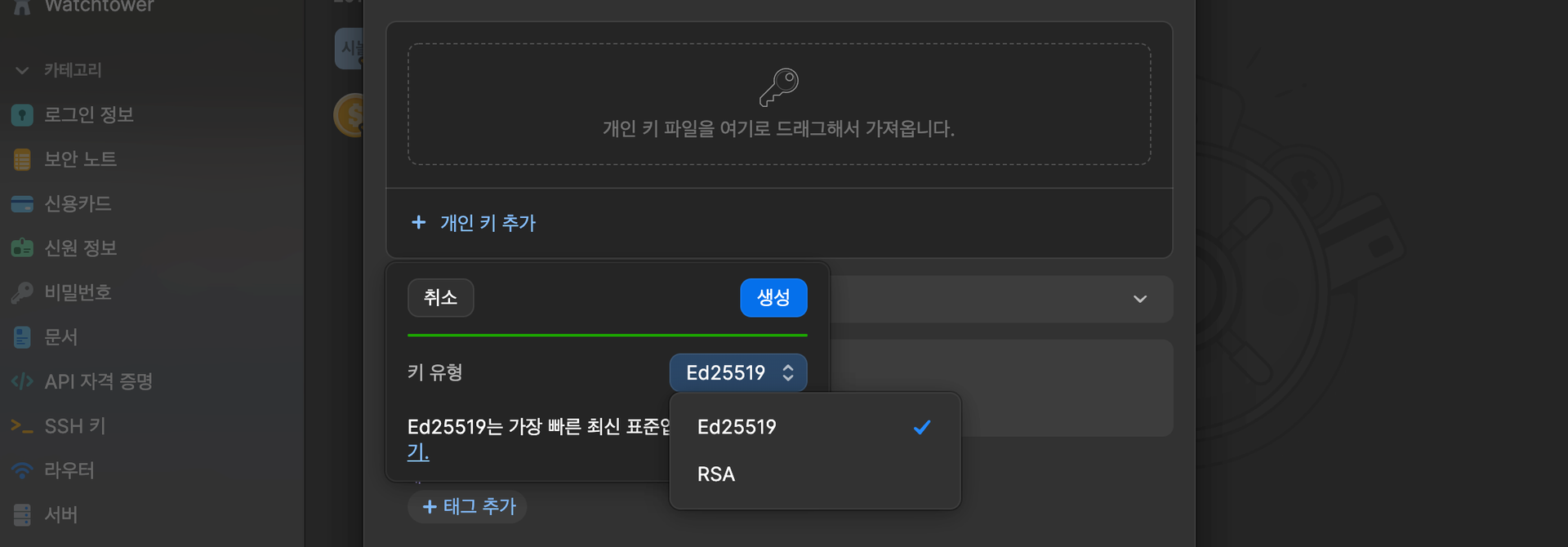 ์ ์ง์ํ๋ฉฐ, ๊ธฐ์กด SSH ํค๋ฅผ ๋ถ๋ฌ์์ ์ ์ฅํ ์๋ ์๋ค. ์ฐธ๊ณ ๋ก *.pem ํ์ผ์ 1Password์ ๋ถ๋ฌ์์ ์ ์ฅํ ํ, ๊ฐ์ธํค๋ฅผ ๋ค์ ๋ค์ด๋ก๋ํด์ ์ฌ์ฉํ ๋ pem ํ์ฅ์๋ฅผ ์ถ๊ฐํด์ผ ํ๋ค.