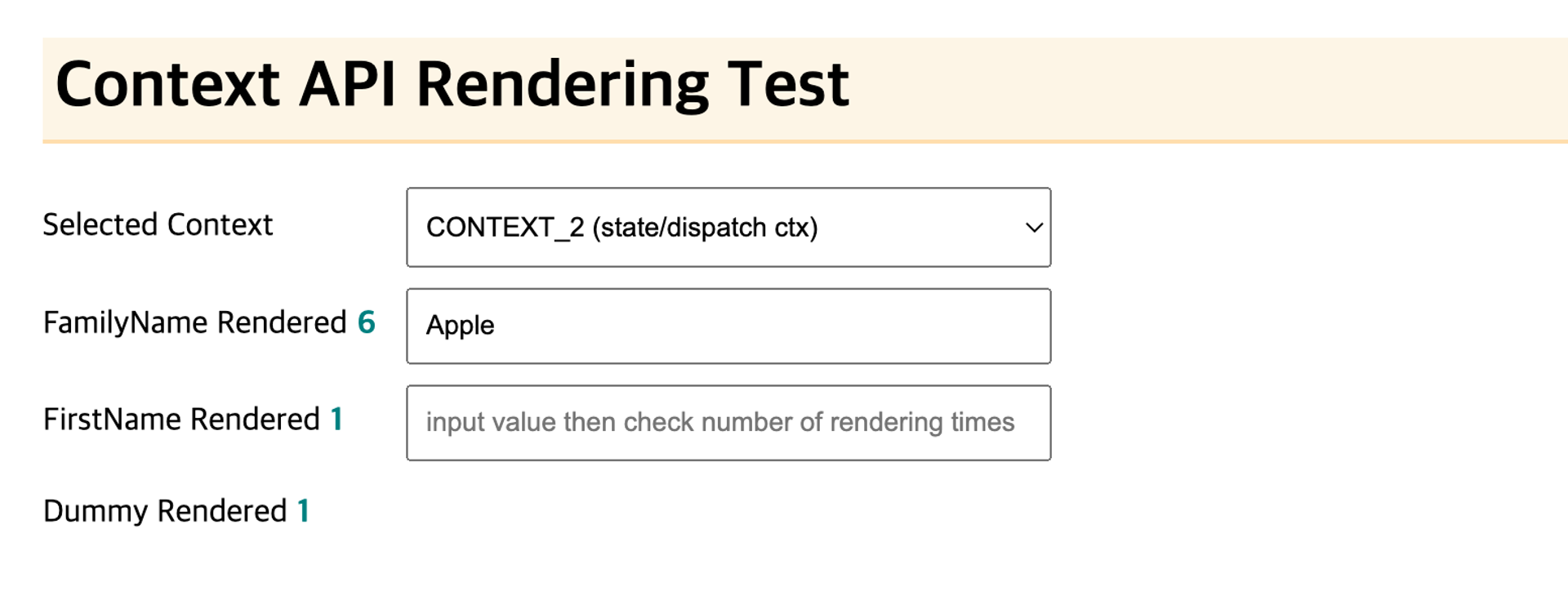 useReducer๋ฅผ ์ฌ์ฉํ ๋์ ๋ ๋๋ง ์ต์ ํ ์ญ์ โ์ํ/๋์คํจ์น Context๋ฅผ ์ชผ๊ฐ๊ฑฐ๋, โuseMemo(๋์คํจ์น Context๋ฅผ ๋ง๋ค์ง ์์๋)๋ฅผ ์ฌ์ฉํ๋ฉด ๋๋ค. ์๋๋ 1๊ฐ reducer๋ง ์ฌ์ฉํด์ FamilyName, FirstName์ ํด๋นํ๋ ์ํ ๊ฐ์ ์ปจํ