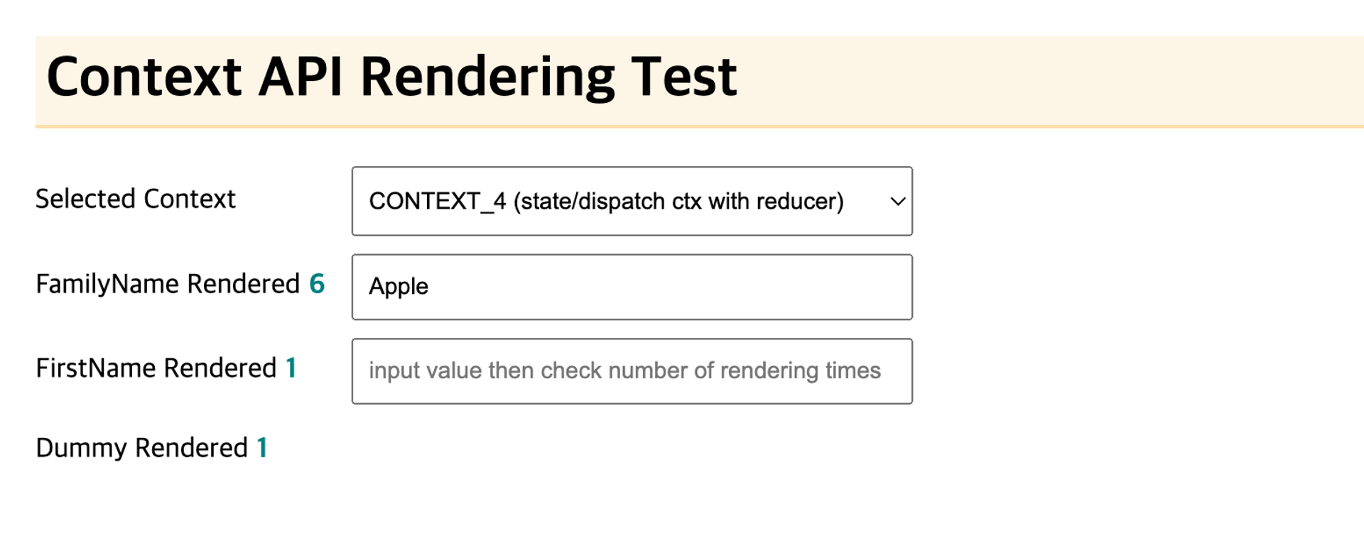 useReducer๋ฅผ ์ฌ์ฉํ ๋์ ๋ ๋๋ง ์ต์ ํ ์ญ์ โ์ํ/๋์คํจ์น Context๋ฅผ ์ชผ๊ฐ๊ฑฐ๋, โuseMemo(๋์คํจ์น Context๋ฅผ ๋ง๋ค์ง ์์๋)๋ฅผ ์ฌ์ฉํ๋ฉด ๋๋ค. ์๋๋ 1๊ฐ reducer๋ง ์ฌ์ฉํด์ FamilyName, FirstName์ ํด๋นํ๋ ์ํ ๊ฐ์ ์ปจํ