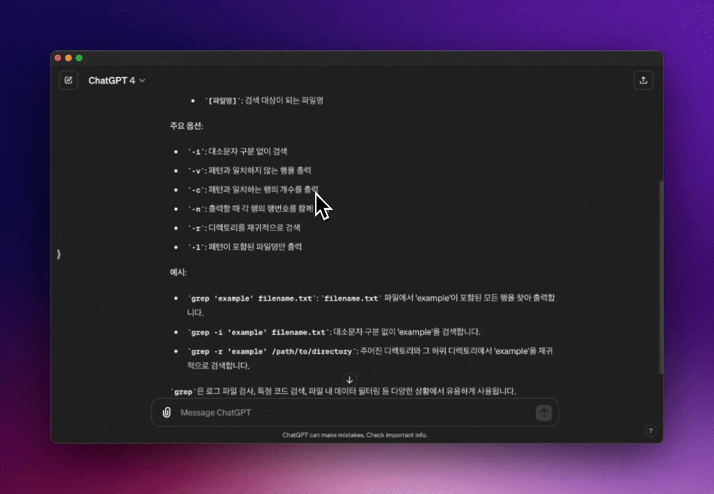 [미립자팁] 은근히 유용한 ChatGPT Reply 기능 2024.05.12 19:52 ⌚️ Productivity 반응형 얼마 전부터 ChatGPT에 Reply라는 기능을 사용할 수 있게 됐다. GPT 답변 내용 중 일부를 드래그하거나 더블클릭하면 커서 위에 큰따옴표 아이콘이 표시된다. 클릭하면 하단 채팅창에 드래그한 문장이 삽입되고 추가 질문을 이어 나갈 수 있다. GPT 답변 중 모르는 내용이 있거나 자세한 설명이 필요할 때 사용하면 유용한 기능. 반응형 공유하기 게시글 관리 로맨테크 저작자표시 비영리 변경금지 (새창열림) '⌚️ Productivity' 카테고리의 다른 글 [macOS] 터미널 고급 명령어(커맨드) 모음 (1) 2024.05.15 [macOS] 맥에서 Windows 설치(부팅) USB 만들기 (0) 2024.05.15 [macOS] 맥 메뉴바에서 미세먼지 상태 확인하기 - Pollution Monitor (3) 2020.08.16 아이폰 원격 제어 프로그램 Wormhole 할인코드/리딤코드 배포 (4) 2020.08.12 맥, 윈도우 PC에서 아이폰, 아이패드 원격 제어하기 - Wormhole (40) 2020.08.12 댓글 공유하기 다른 글 댓글 이 글 공유하기 구독하기 구독하기 카카오톡 카카오톡 라인 라인 트위터 트위터 Facebook Facebook 카카오스토리 카카오스토리 밴드 밴드 네이버 블로그 네이버 블로그 Pocket Pocket Evernote Evernote 다른 글 [macOS] 터미널 고급 명령어(커맨드) 모음 [macOS] 터미널 고급 명령어(커맨드) 모음 2024.05.15 [macOS] 맥에서 Windows 설치(부팅) USB 만들기 [macOS] 맥에서 Windows 설치(부팅) USB 만들기 2024.05.15 [macOS] 맥 메뉴바에서 미세먼지 상태 확인하기 - Pollution Monitor [macOS] 맥 메뉴바에서 미세먼지 상태 확인하기 - Pollution Monitor 2020.08.16 아이폰 원격 제어 프로그램 Wormhole 할인코드/리딤코드 배포 아이폰 원격 제어 프로그램 Wormhole 할인코드/리딤코드 배포 2020.08.12 다른 글 더 둘러보기