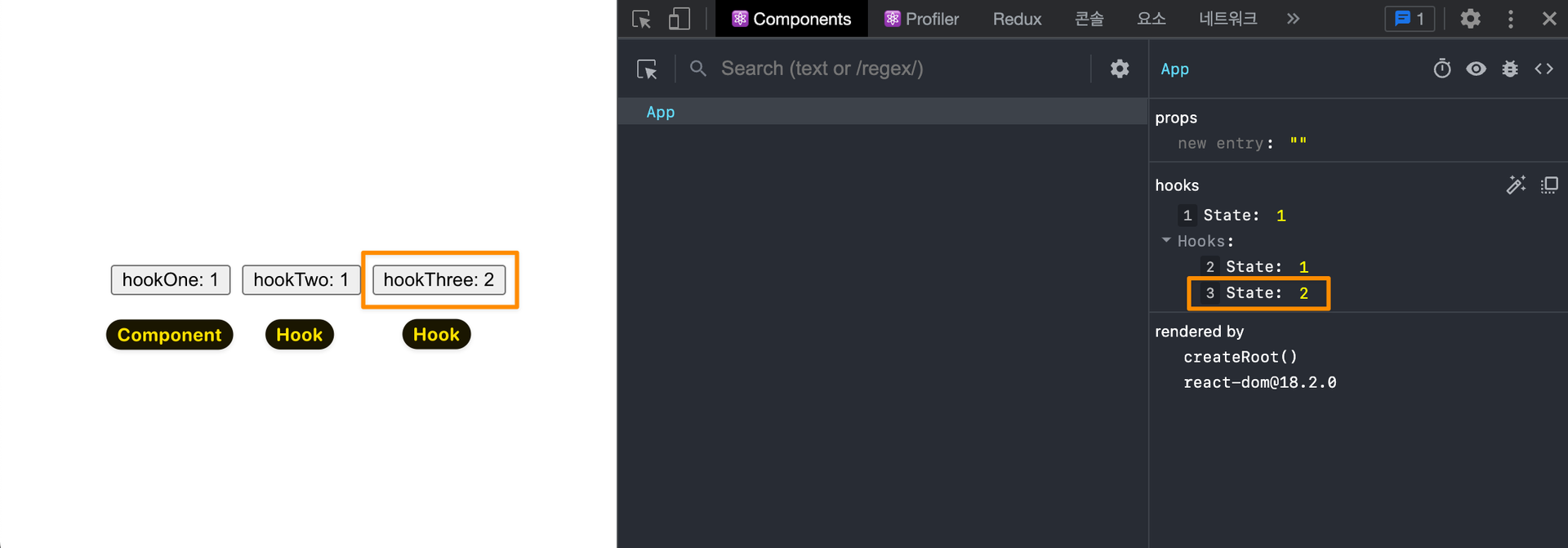 Hook 3์ Components ํญ → App ์ปดํฌ๋ํธ → Hooks(์ปค์คํ ํ ์ ๋ด์ฅ ํ )์ ๋๋ฒ์งธ ํญ๋ชฉ์ ๊ฐ๋ฆฌํจ๋ค. ์ฆ, ๋ฆฌ์กํธ ๊ฐ๋ฐ์ ๋๊ตฌ์์ ์ปค์คํ ํ ์์ฒด๋ ์นด์ดํธ ํ์ง ์๊ณ , ์ปค์คํ ํ ๋ด๋ถ์ ์๋ ๋ด์ฅ ํ ์ ์นด์ดํธ ํ๋ค.