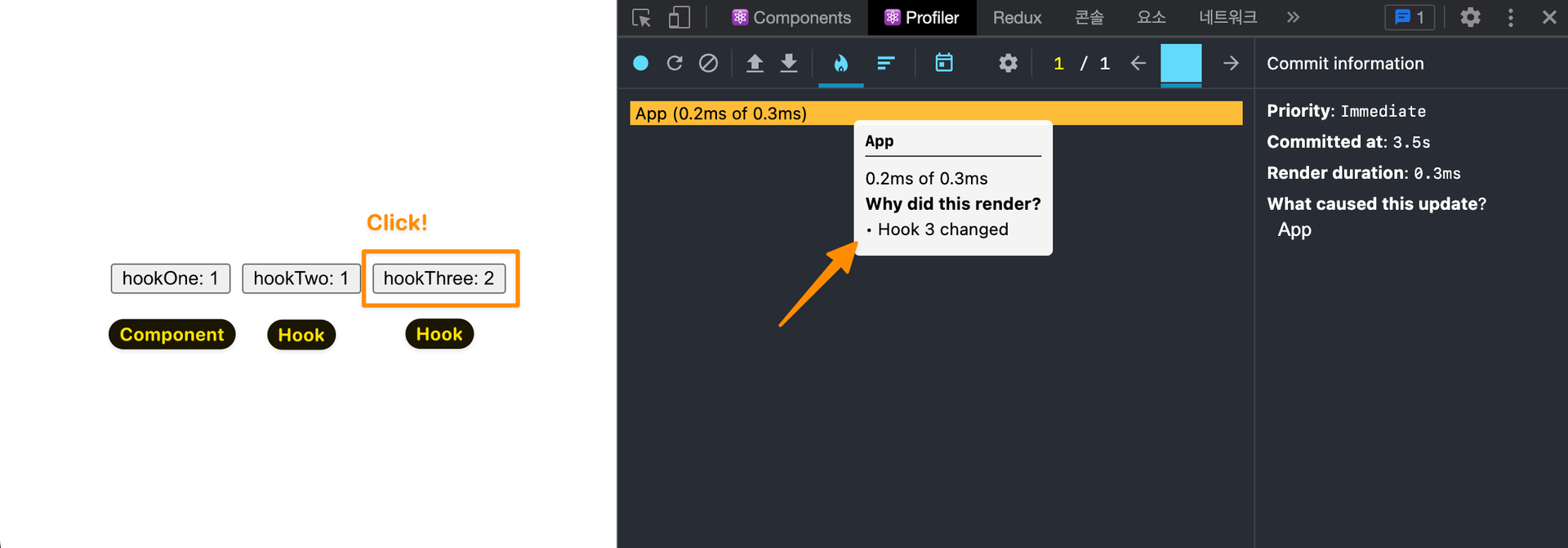 (useState)์ด๋ค. ๋ฒํผ์ ํด๋ฆญํด์ ์ด ๊ฐ์ ๋ณ๊ฒฝํ๋ฉด ๋ฆฌ์กํธ ๊ฐ๋ฐ์ ๋๊ตฌ Profiler ํญ์์ Hook 3 changed๋ฅผ ํ์ํ๋ค.