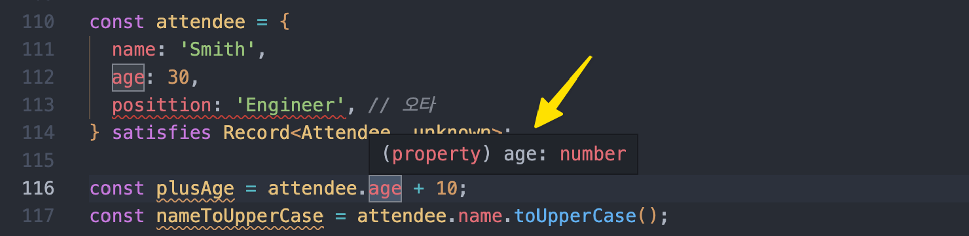 const plusAge = attendee.age + 10; // Error! ts(2365)
