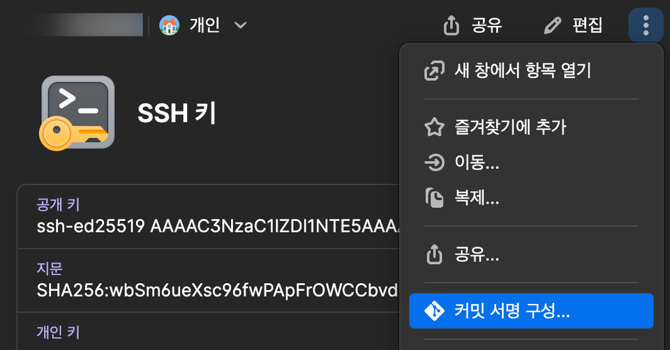 โถ 1Password์ ์ ์ฅํ SSH Key → ์ฐ์ธก ์๋จ ์ค์ ๋ฒํผ(์ธ๋ก ์ 3๊ฐ) → ์ปค๋ฐ ์๋ช ๊ตฌ์ฑ ํด๋ฆญ