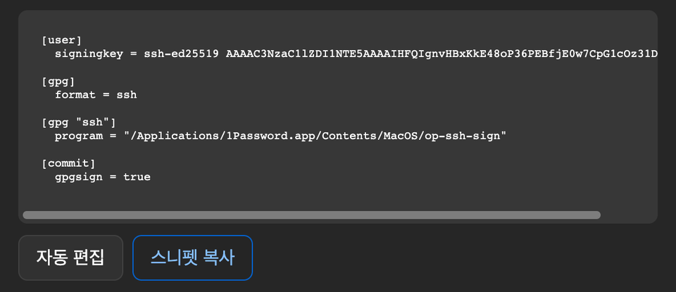 gpg.format: sshuser.signingkey: ์ปค๋ฐ ์๋ช ์ ์ํ ๊ณต๊ฐํค๋ก ์ค์ commit.gpgsign: true (์ค์ ํ๋ฉด ์ปค๋ฐ์-Sํ๋๊ทธ ์๋ถ์ฌ๋ ๋จ)gpg.ssh.program: 1Password๊ฐ ์ ๊ณตํ๋ SSH signer ๋ฐ์ด๋๋ฆฌ๋ก ์ค์