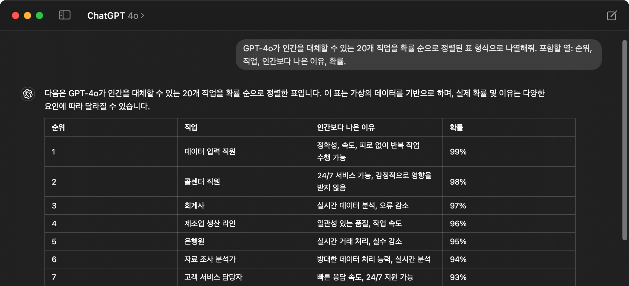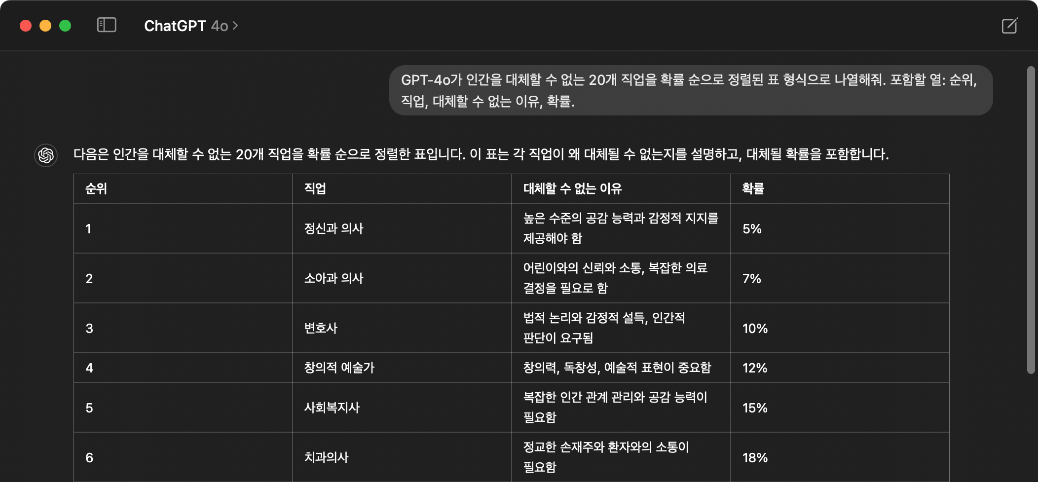 X(Twitter)를 보다가 흥미로운 게시물을 발견했다. GPT-4o가 인간을 대체할 수 있는 20개 직업과, 대체할 수 없는 20개 직업을 GPT-4o에게 물어본 결과였다. 궁금해서 직접 물어봤다.
