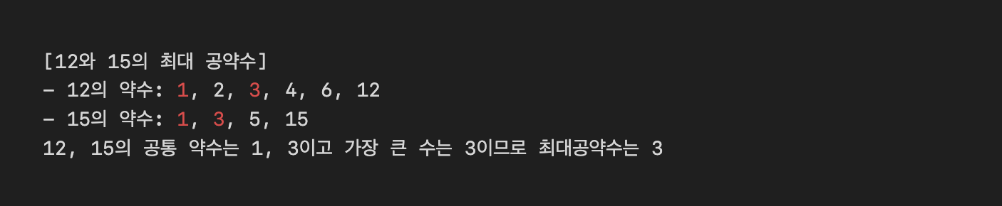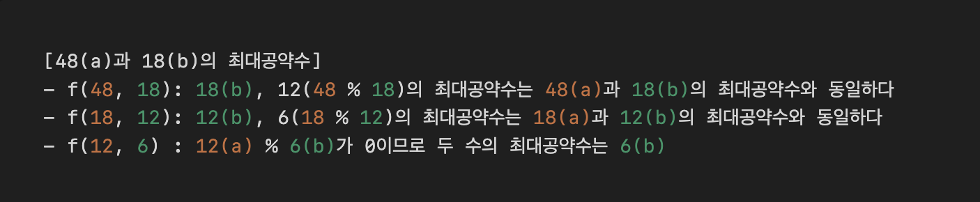 ์ ์ฝ๋์์ ์ต๋๊ณต์ฝ์๋ฅผ ๊ณ์ฐํ๋ ๋ถ๋ถ์ ์ ํด๋ฆฌ๋ ์๊ณ ๋ฆฌ์ฆ์ด ์ ์ฉ๋๋ค. ์ต๋๊ณต์ฝ์๋ ๋ ์(ํน์ ๊ทธ ์ด์)๊ฐ ๊ณตํต์ผ๋ก ๊ฐ์ง๋ ์ฝ์ ์ค ๊ฐ์ฅ ํฐ ์๋ฅผ ์๋ฏธํ๋ค(๋ ์๊ฐ ๋์์ ๋๋์ด ๋จ์ด์ง๋ ๊ฐ์ฅ ํฐ ์). ์ฝ์๋ ์ด๋ค ์๋ฅผ ๋๋์ด ๋จ์ด์ง๊ฒ ํ๋ ์(๋๋จธ์ง 0)์ด๋ค.