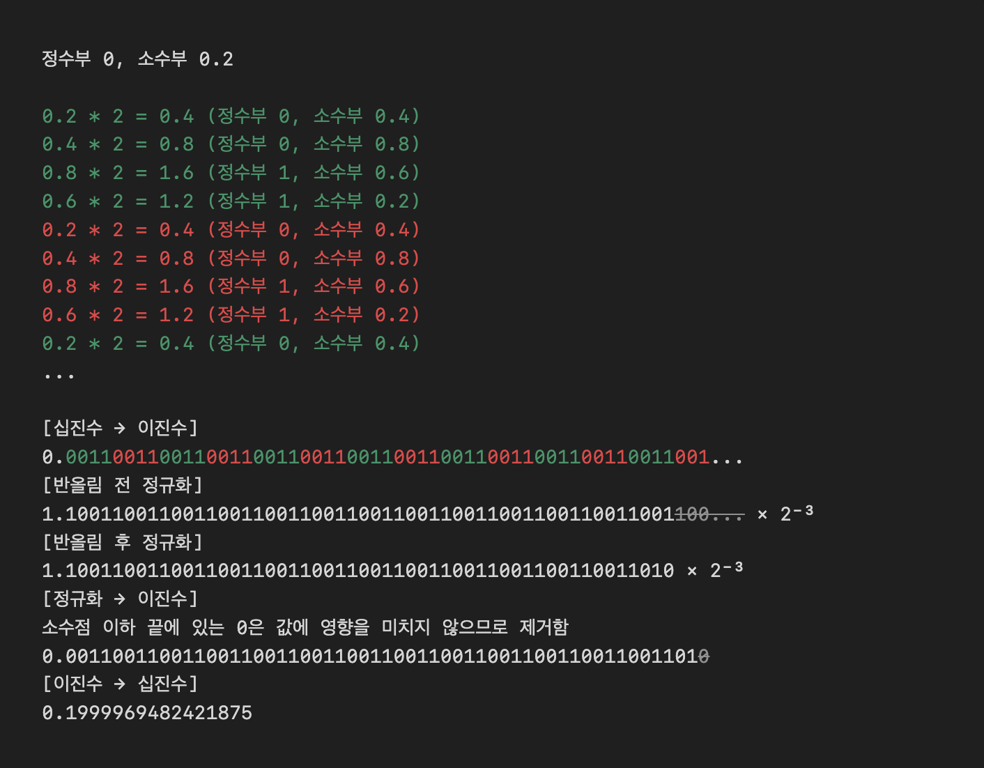 0.3 ๊ฐ์ ์์๋ฅผ 2์ง์๋ก ๋ณํํด ๋ณด๋ฉด $0.01001100110011001\cdots$ ์ด๋ ๊ฒ ์ผ์ ํ ํจํด(1001)์ด ๊ณ์ ๋ฐ๋ณต๋๋๋ฐ ์ด๋ฌํ ์ซ์๋ ๋ฌดํํ ๋ฐ๋ณต๋๋ ์ด์ง ์์๋ผ๊ณ ๋ถ๋ฅธ๋ค. ์ด๋ฌํ ๋ฌดํ ์์๋ ์์์ ์๋์ ์ซ์๊ฐ ๋์์ด ๋ฐ๋ณต๋๋ฏ๋ก ์ ํํ 2์ง์ ํํ์ ๊ฐ์ง ์๋๋ค. ์ปดํจํฐ๋ ์ด๋ฌํ ์ ํ์ ์์๋ฅผ ์ ํํ๊ฒ ํํํ๊ฑฐ๋ ๊ณ์ฐํ ์ ์๊ธฐ ๋๋ฌธ์ ๊ทผ์ฟ๊ฐ์ ์ฌ์ฉํด์ ํํํ๋ค.