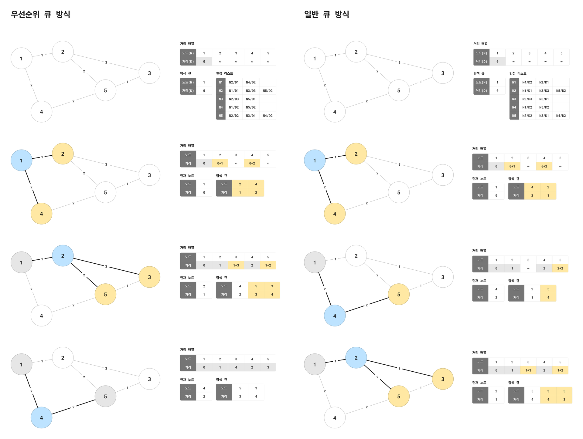- ํ์ ํ : ๋ค์๋ฒ ๋ฐฉ๋ฌธํ ๋ ธ๋ ๋ชฉ๋ก. ์ผ๋ฐ์ ์ผ๋ก ๊ฑฐ๋ฆฌ๊ฐ ์งง์ ๋ ธ๋๋ฅผ ํจ์จ์ ์ผ๋ก ๊ฒ์ํ๊ณ ๋จผ์ ๋ฐฉ๋ฌธํ๊ธฐ ์ํด ์ฐ์ ์์ ํ๋ก ๊ตฌํํ๋ค. ํ์ ํ์ ์ด๊ธฐ๊ฐ์ ์ถ๋ฐ ๋ ธ๋๋ก ์ค์ ํ๋ค.