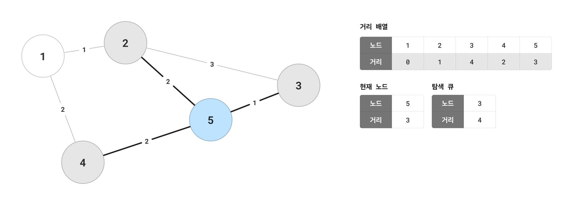 ๋ค์ ํ์ ํ์์ ๊ฑฐ๋ฆฌ๊ฐ ๊ฐ์ฅ ์งง์ ๋ ธ๋๋ฅผ ๊บผ๋ธ๋ค. ์์ ๋์ผํ๊ฒ ์ธ์ ํด ์๋ ๋ ธ๋์ ๊ฑฐ๋ฆฌ๋ฅผ ํ์ธํ๋ค. ํ์ง๋ง ์ต๋จ ๊ฑฐ๋ฆฌ ๋ฐฐ์ด์ ๋ชจ๋ ์์ฑํ์ผ๋ฏ๋ก ํ์ ์๋ N4, N5, N3์ ๋ชจ๋ ๊บผ๋ด์ ํ์ธํด๋ ๊ฑฐ๋ฆฌ ๋ฐฐ์ด์ ์๋ ๊ฐ์ด ๋ ์์ผ๋ฏ๋ก ๋ณ๊ฒฝ๋๋๊ฑด ์๋ค.