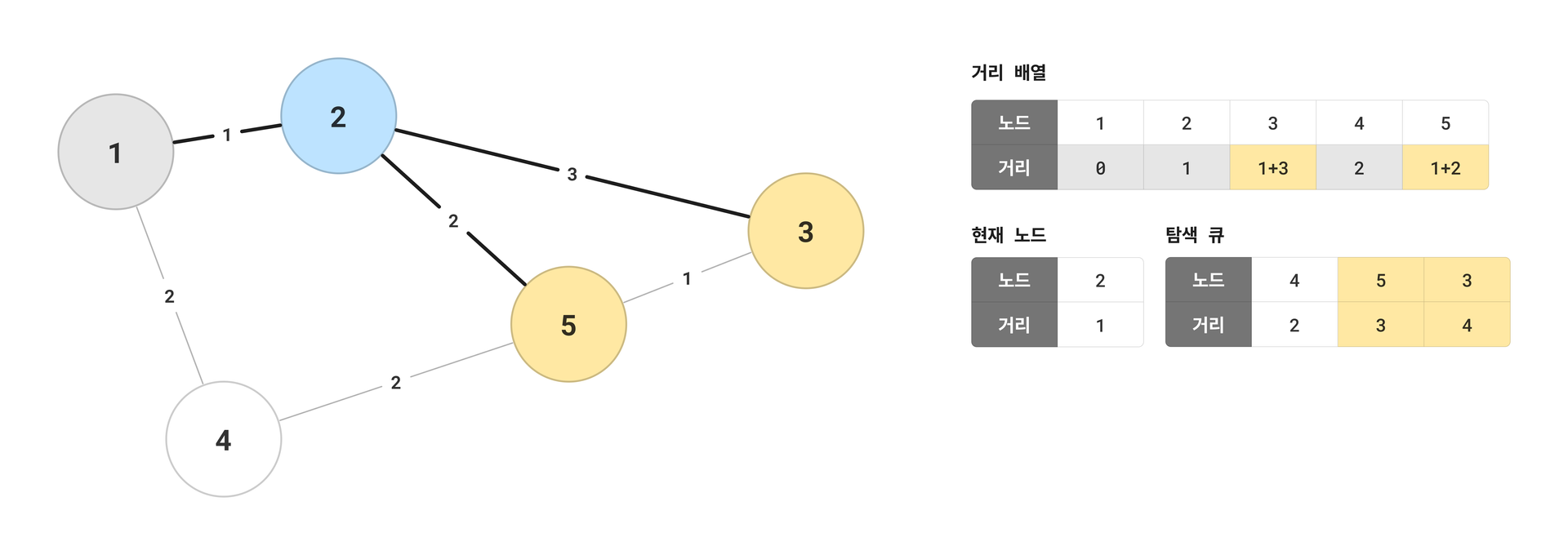 ์ด์ ํ์ ํ์์ ๊ฑฐ๋ฆฌ๊ฐ ๊ฐ์ฅ ์งง์ ๋ ธ๋๋ฅผ ์ดํด๋ณธ๋ค. N2 ๋ ธ๋์ ๊ฑฐ๋ฆฌ๊ฐ ๊ฐ์ฅ ์งง์ผ๋ฏ๋ก ํ์ ํ์์ ๊บผ๋ธ๋ค. N2๋ N1, N3, N5์ ์ธ์ ํด ์๋ค. ๊ฐ๊ฐ ๊ฑฐ๋ฆฌ๋ฅผ ์ดํด๋ณธ๋ค.